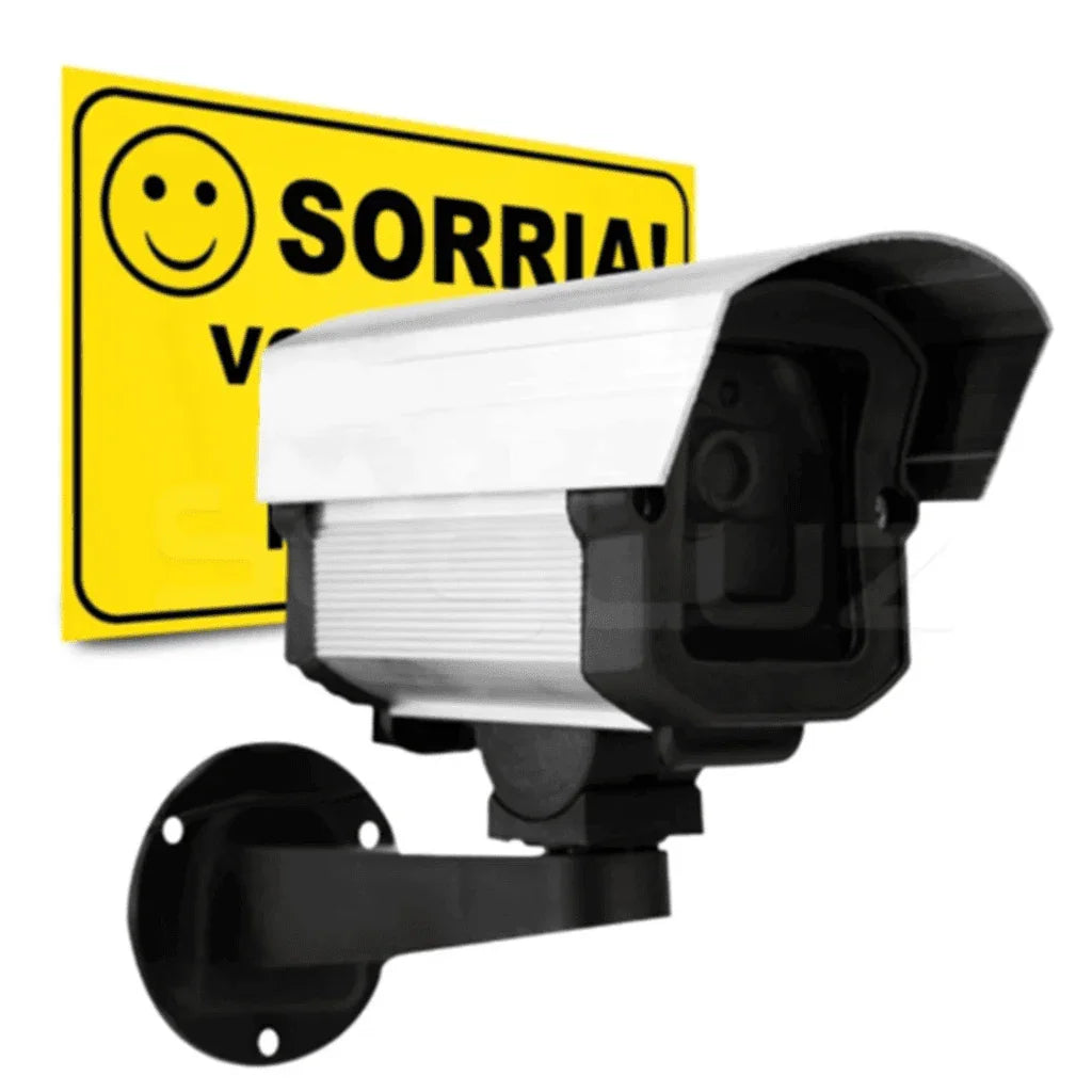 Câmera Falsa de Segurança com LED + Placa “Sorria, Você Está Sendo Filmado”